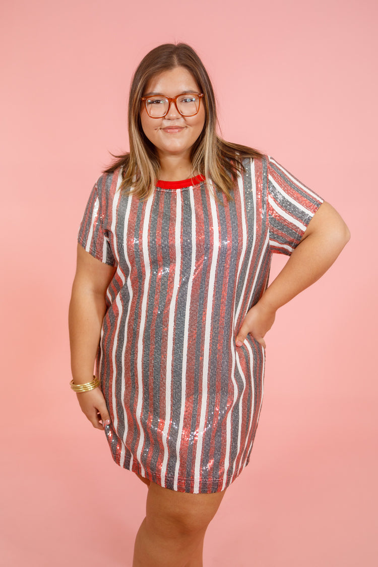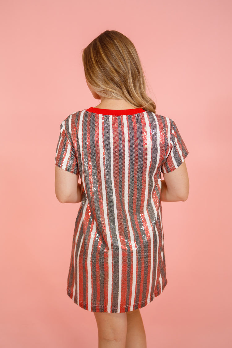 The Julia Sequin Dress combines playful style with ultimate comfort, featuring eye-catching all-over sequin stripes on the outside and a soft terry lining inside. Its straight-relaxed fit provides a classic silhouette with ease of wear. Perfect for gameday, the Julia Sequin Dress is an effortless pull-on style that ensures you look fabulous with minimal effort.