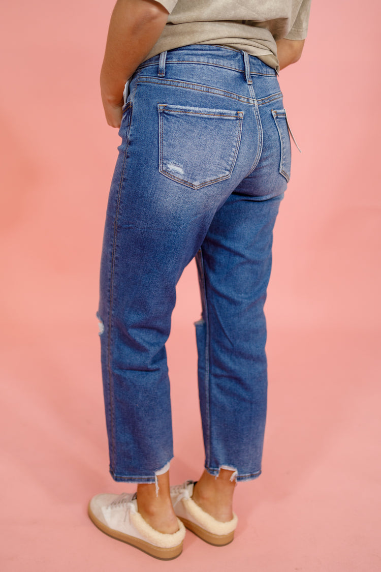 HIGH RISE STRAIGHT JEANS COMFORT STRETCH DENIM, HIGH RISE WAIST, DISTRESSED DETAIL, CROPPED LENGTH, STRAIGHT JEANS F. RISE: 10" / INSEAM: 27" / LEG OPENING: 16"
