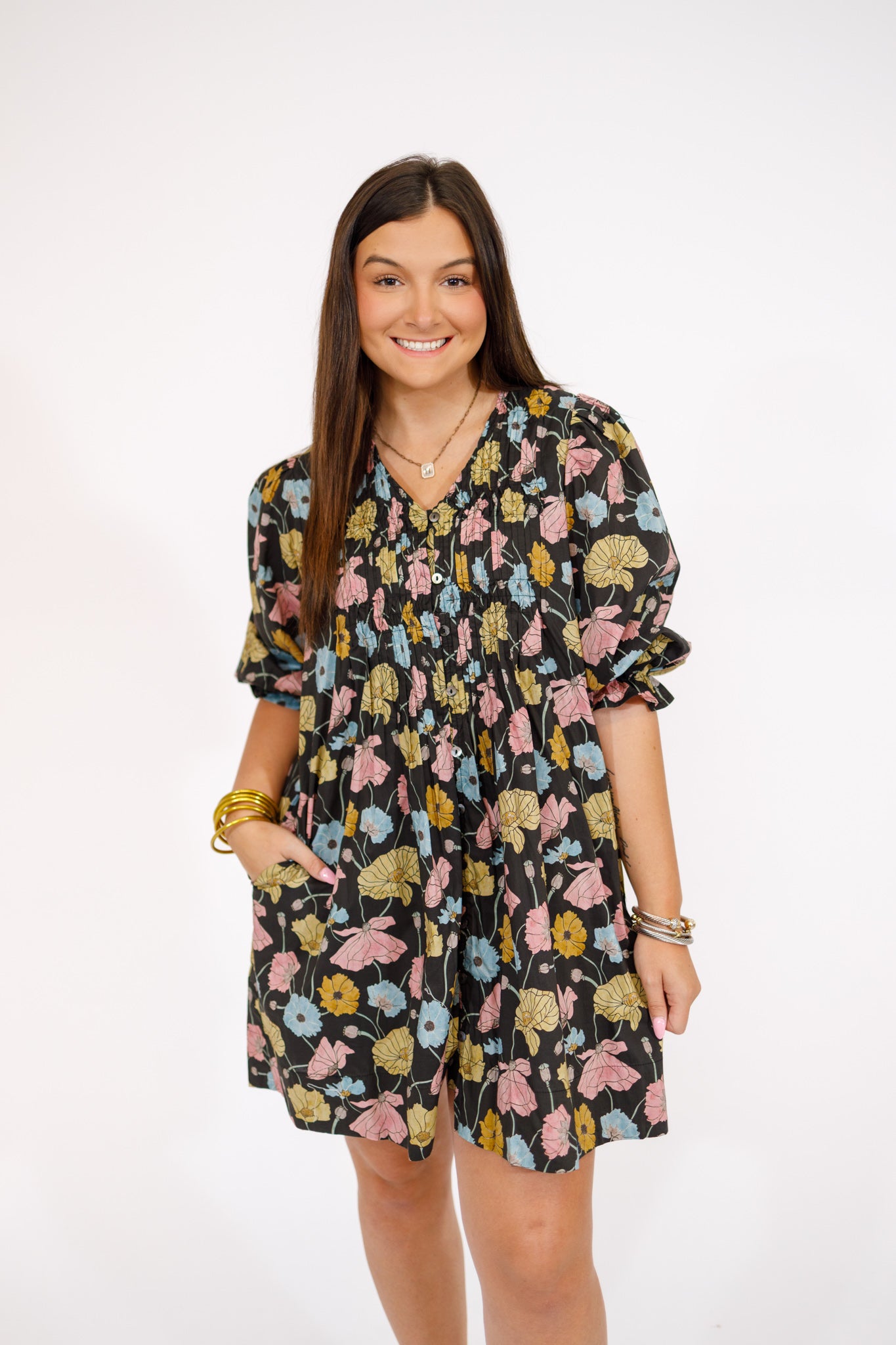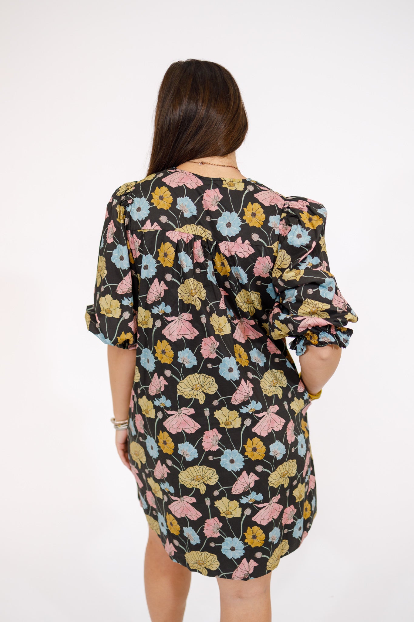 Brighten your wardrobe with the Black Multi Floral Bubble Sleeve Dress, featuring bubble sleeves and a fresh floral print for effortless style.