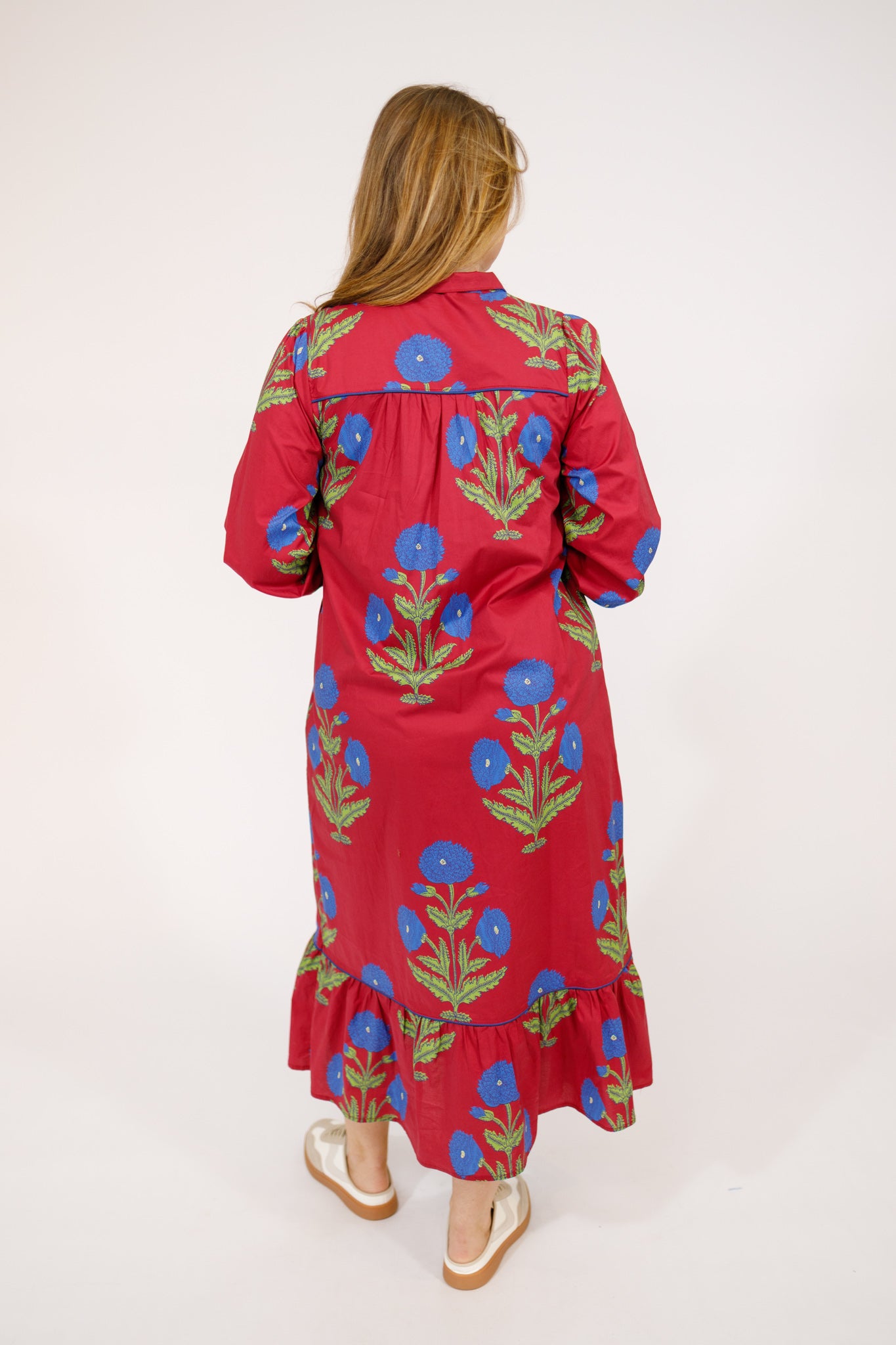 Long sleeves standing neckline floral midi dress, ruffle hem.