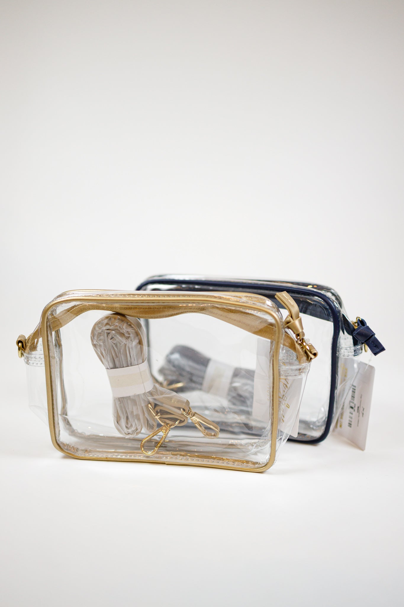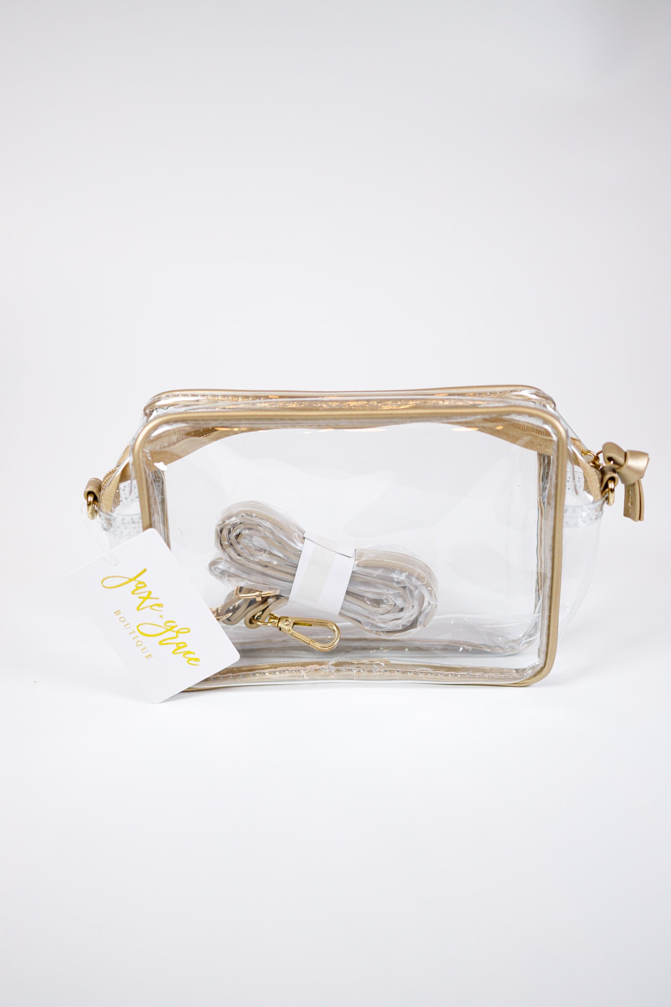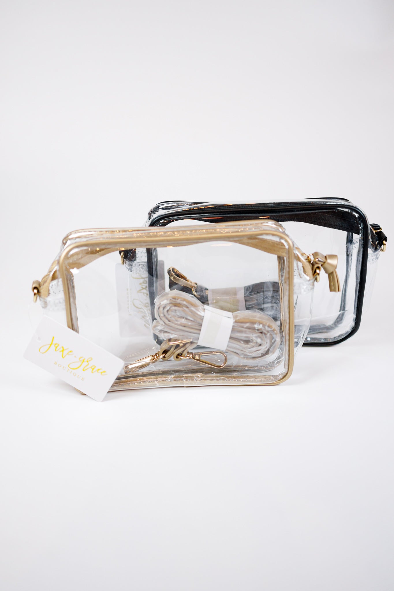 Meet your new favorite clear purse, beautifully styled to take you from day to night! What’s to love about the Bridget: * Crafted of clear vinyl and soft vegan leather, featuring brass hardware accents * Stadium Approved Sized at 8" x 6" x 2" * Includes matching adjustable vegan leather strap * Easily wipes clean * zipper closure