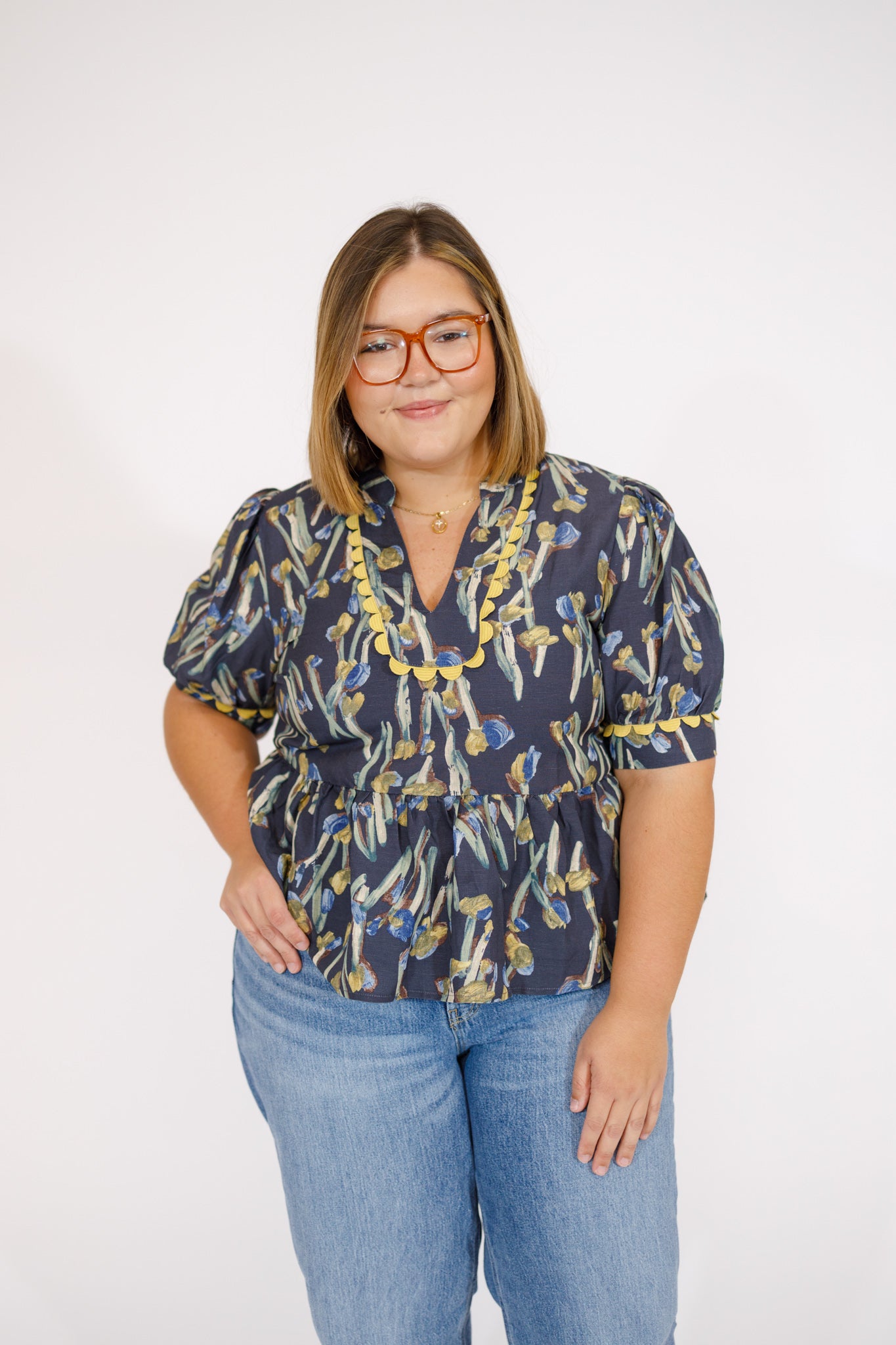 Curvy Navy Printed Scalloped Sleeve Top
