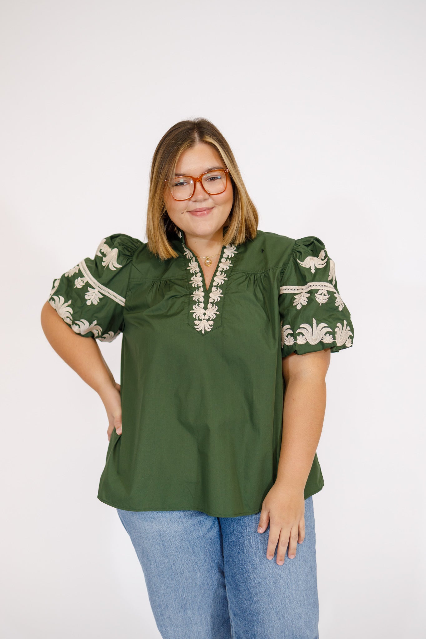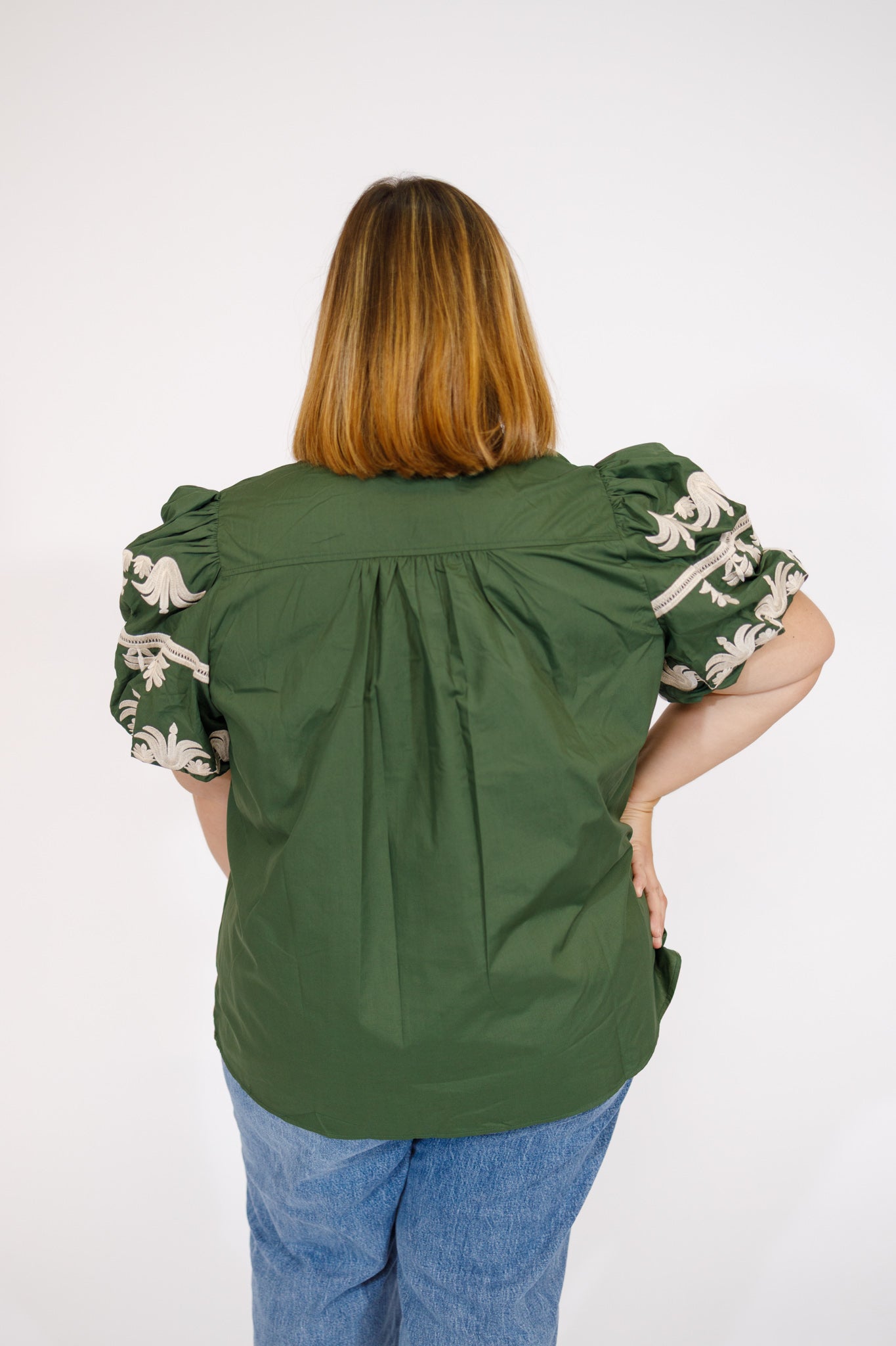 Curvy Olive Embroidered Bubble Sleeve Top