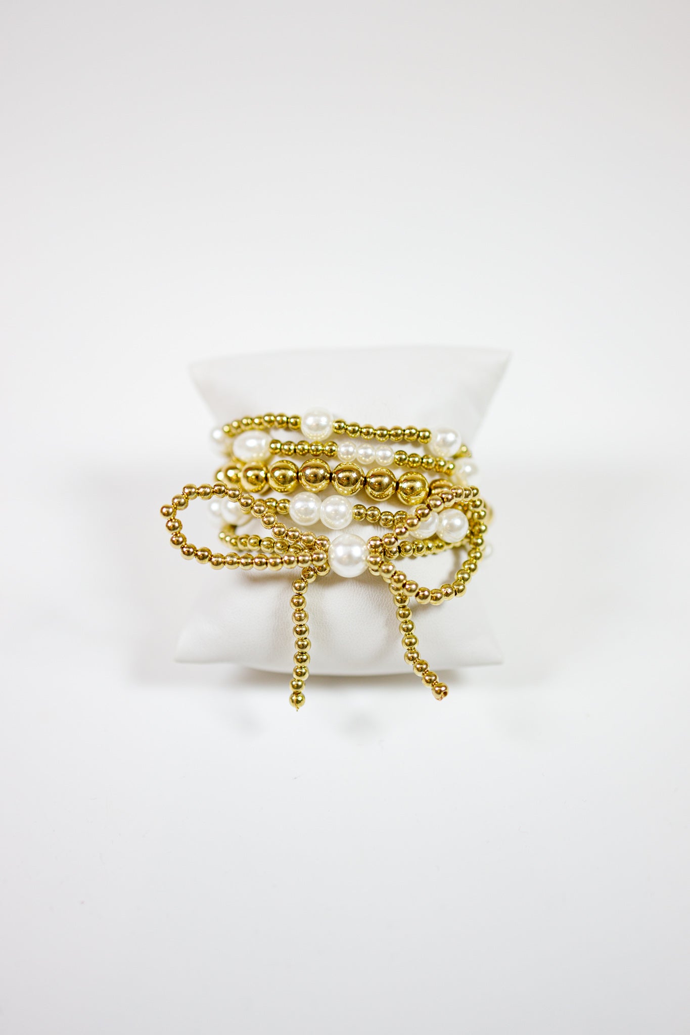 Add a touch of charm with this playful set featuring gold beaded bracelets paired with elegant pearl accents and a cute bow detail.