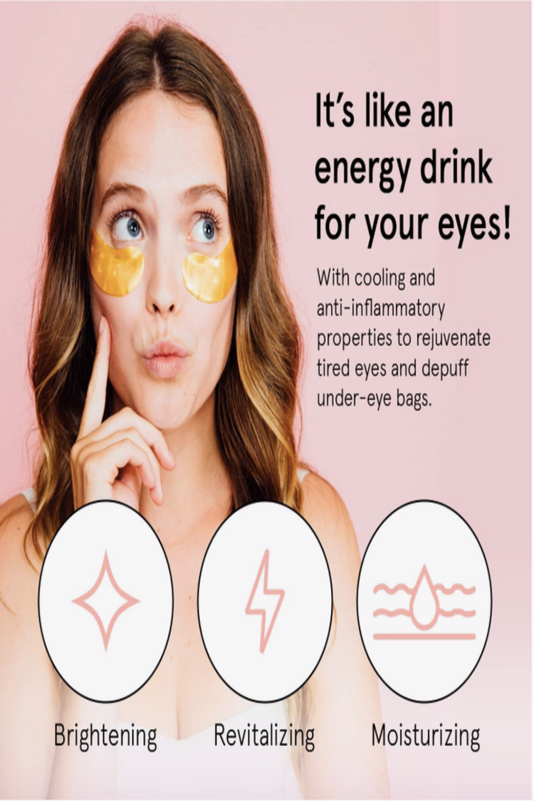 It's like an energy drink for your eyes! (GOLD) Superhero eye masks that have cooling and de-puffing powers to revitalize your tired eyes, giving you a youthful, awakened glow. These nutrient-rich gold jellies work to reduce the appearance of puffiness and dark circles, especially when kept cold. Talk about 24k magic.