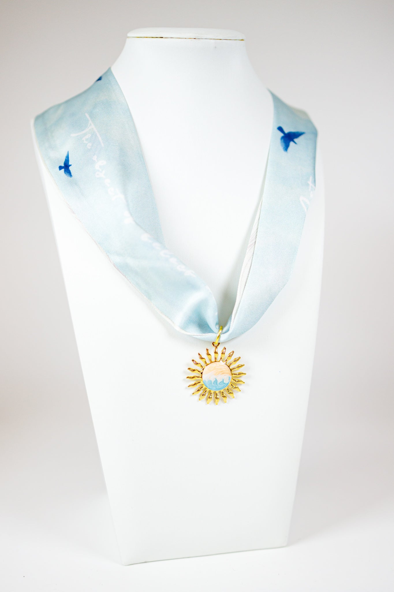 Add a splash of whimsy to your outfit with the HD Blue Bird Sun Charm Scarf Necklace, a fun and stylish accessory that brightens any look.