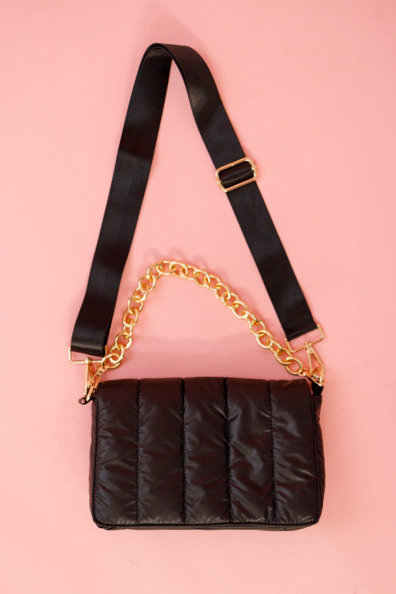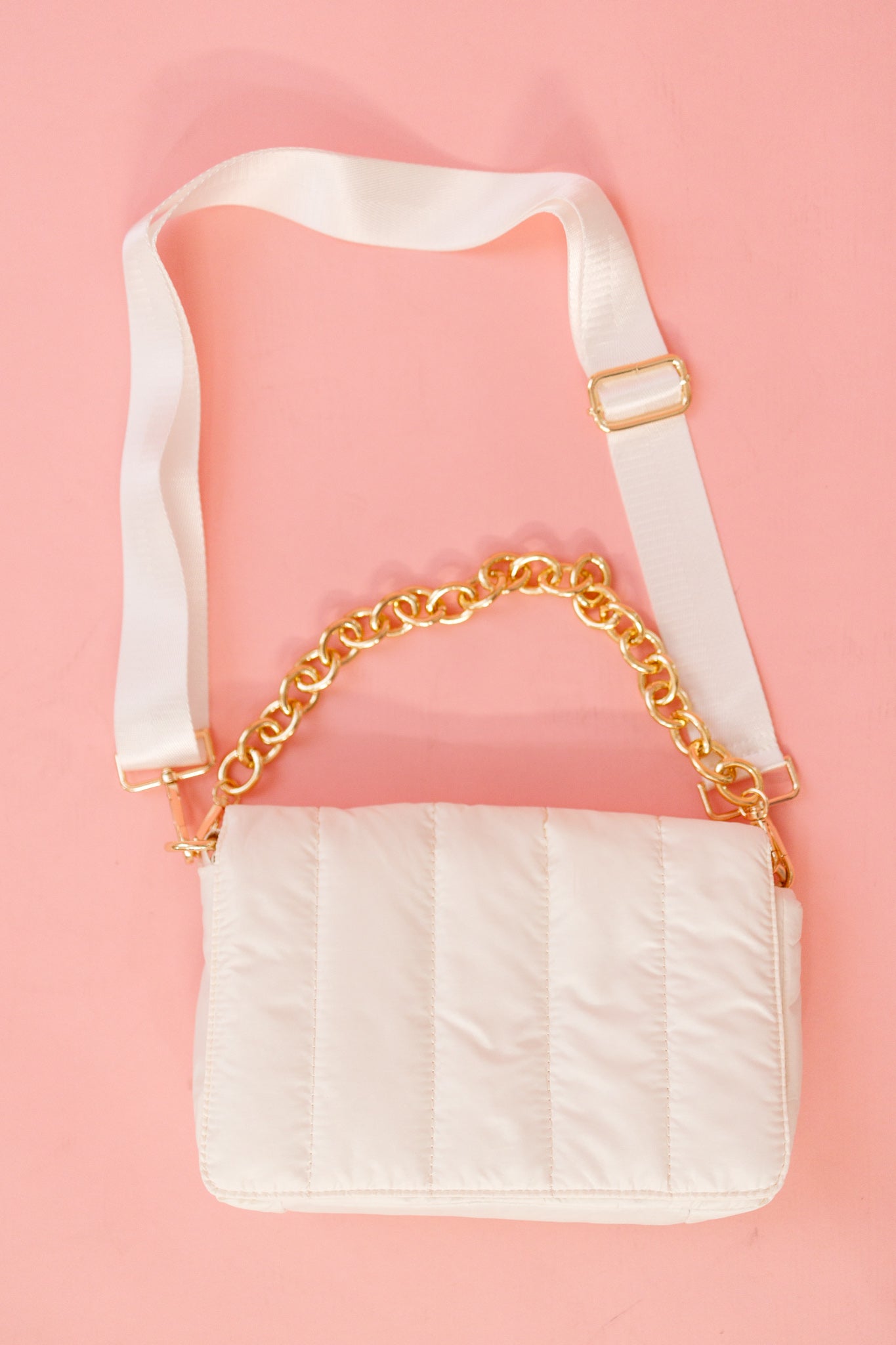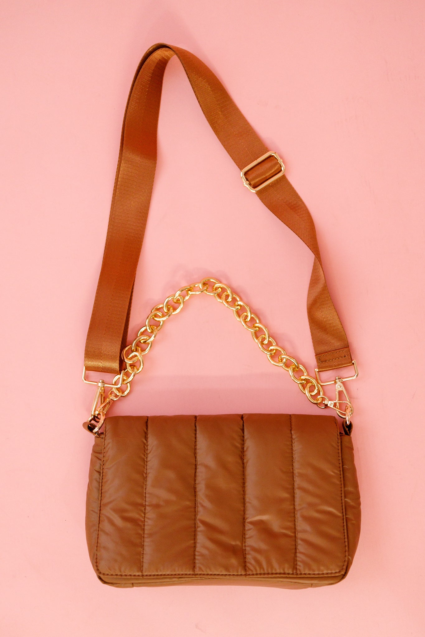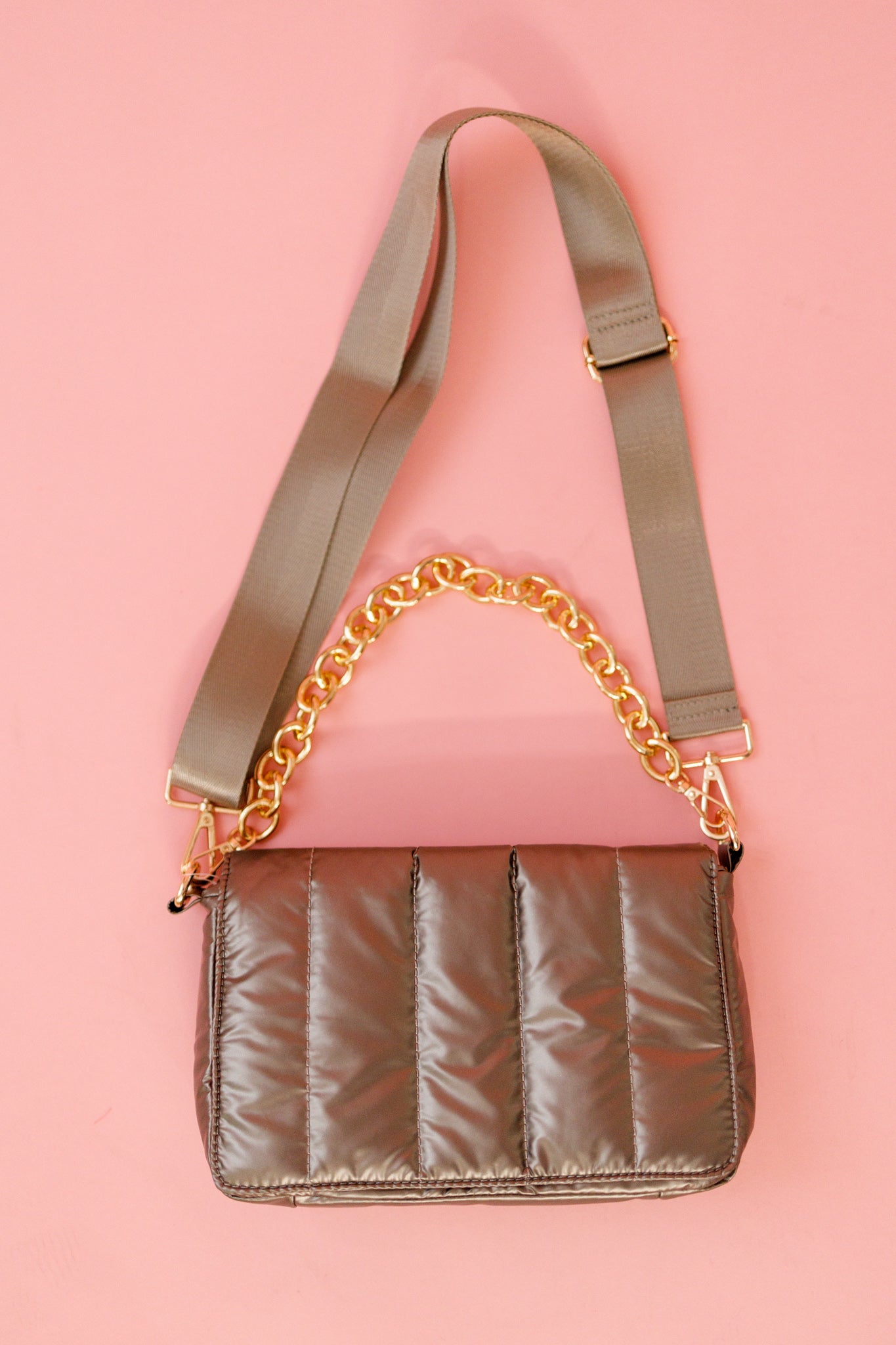 Quilted puffer style snap closure crossbody with open inner pocket & zipper pocket Adjustable/detachable crossbody strap Removable chain strap Dimensions: 10"L x 6"H x 3"D
