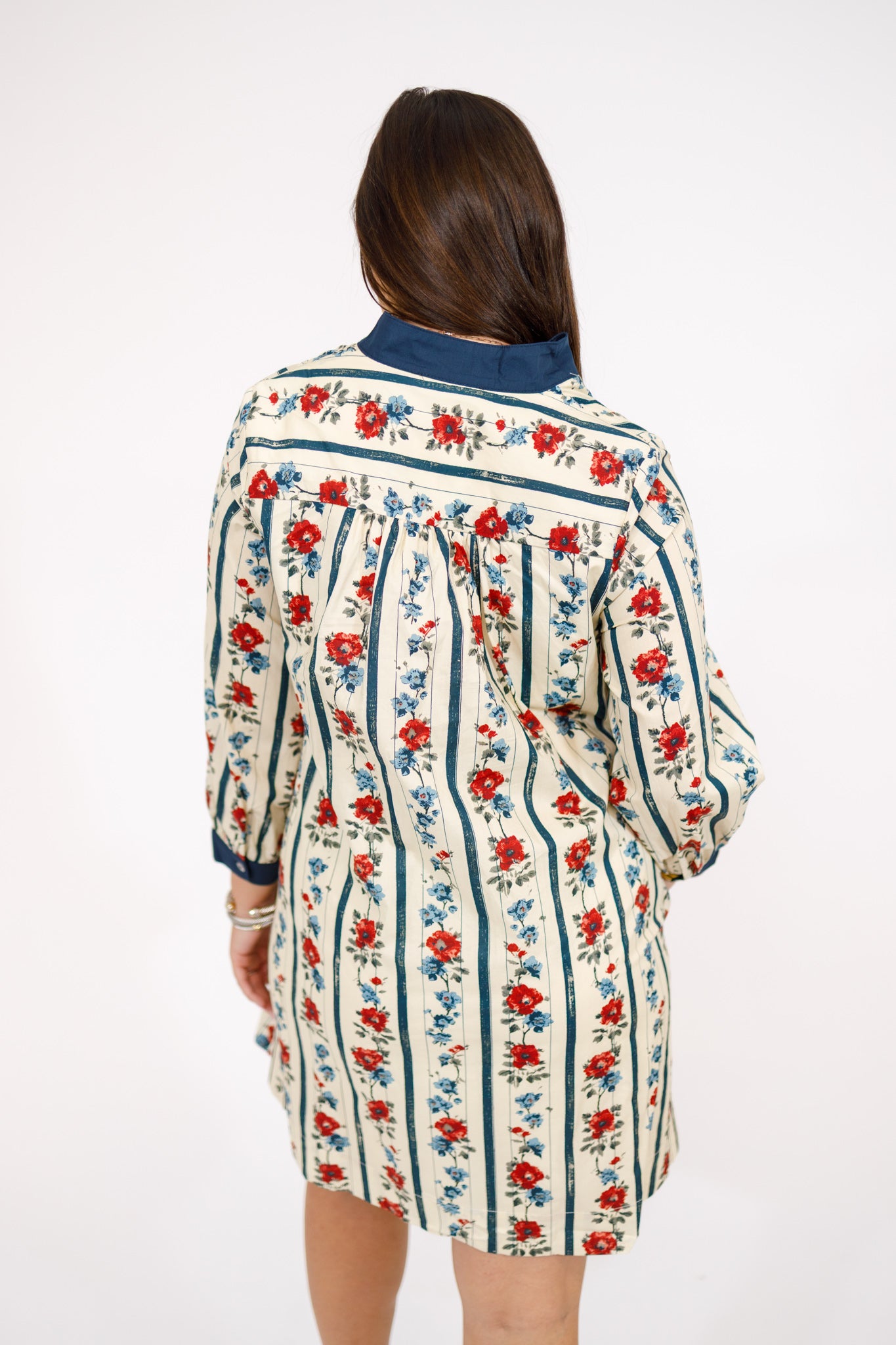 Navy Floral and Stripe Bubble Sleeve Mini Dress