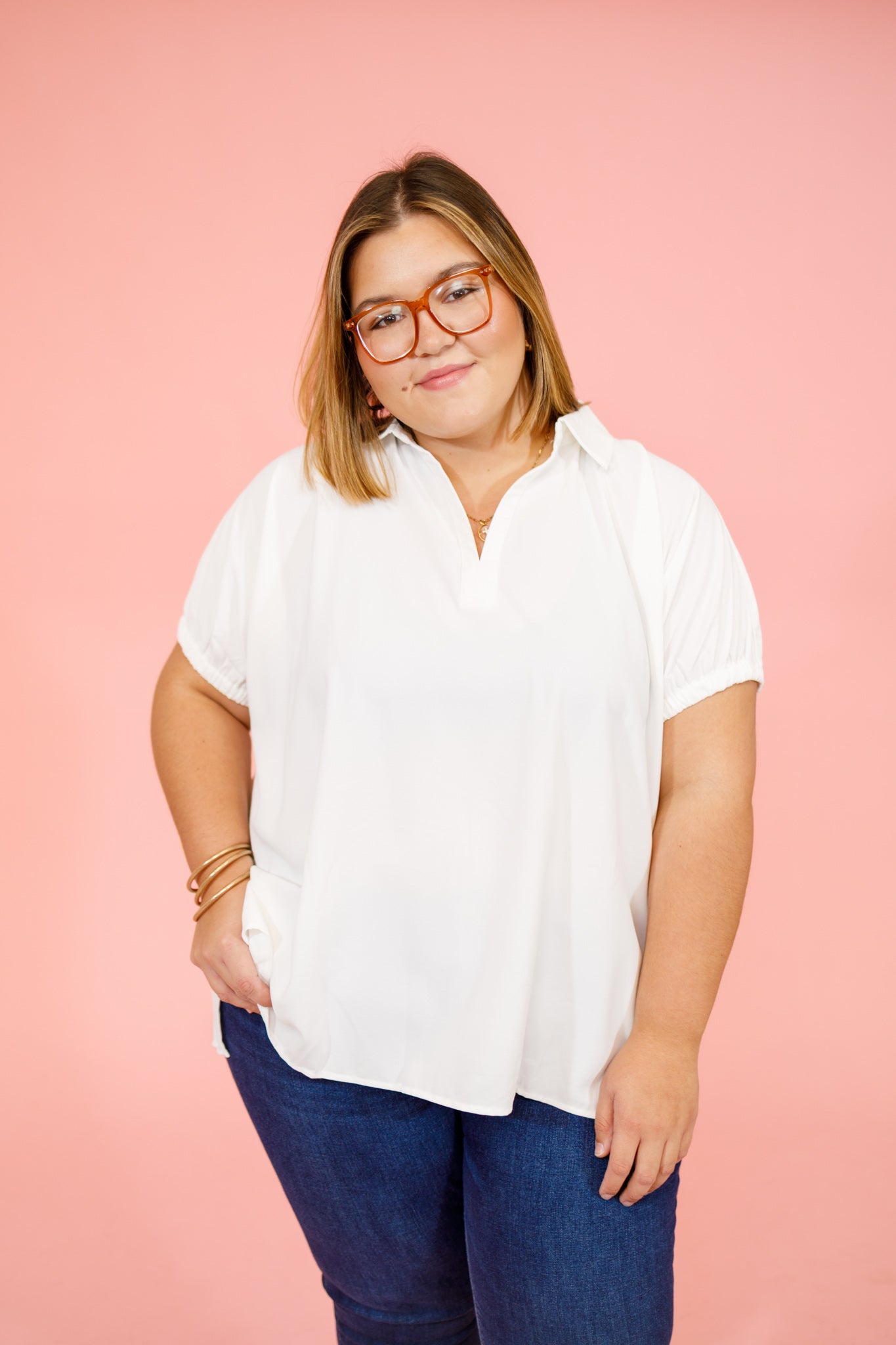 Solid short sleeve split collar side slit hem top. Unlined. Woven. Non-sheer. Lightweight.