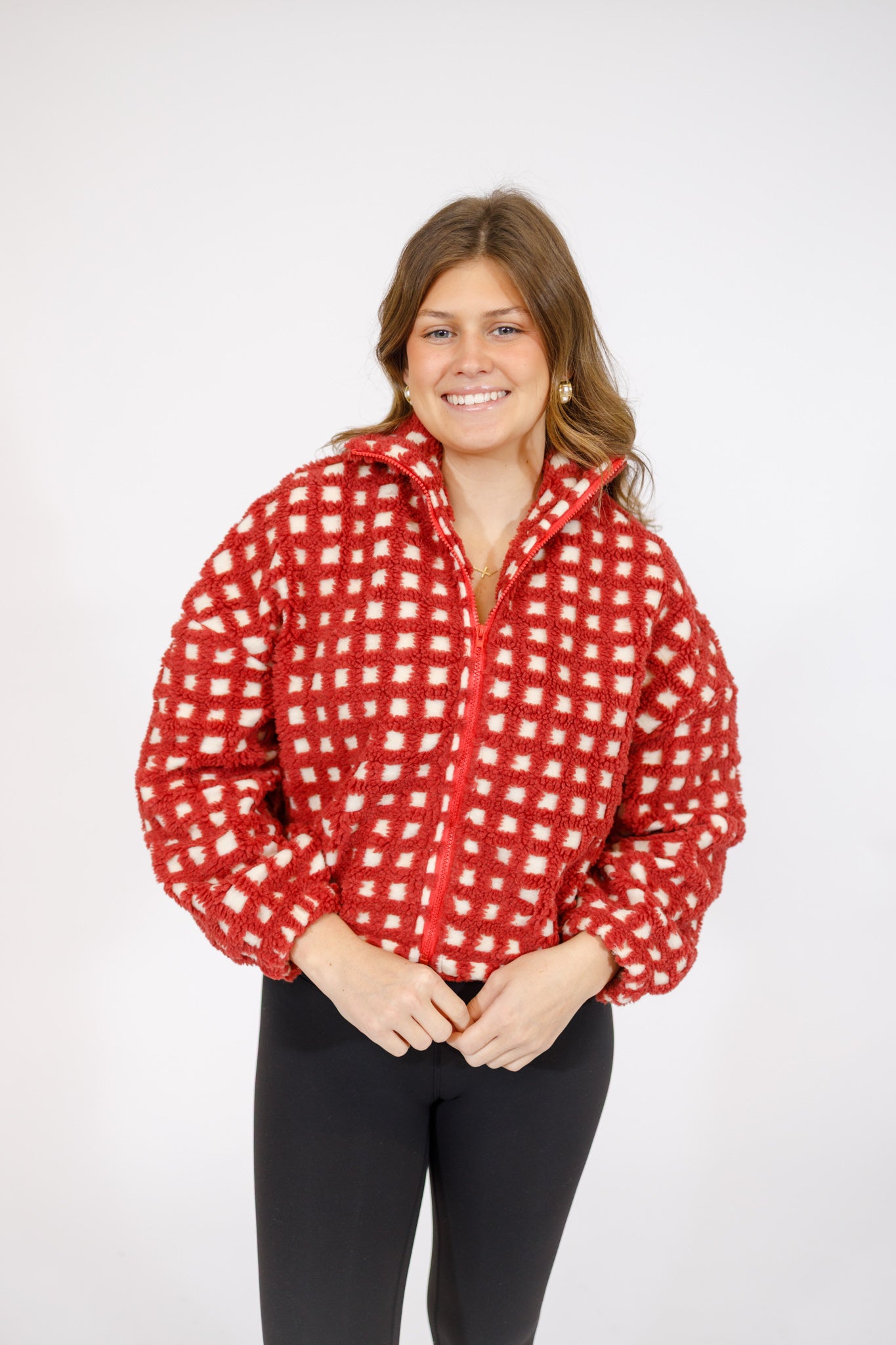 This oversized sherpa fleece jacket features a charming red gingham check pattern. Soft, cozy, and perfect for layering on cooler days.