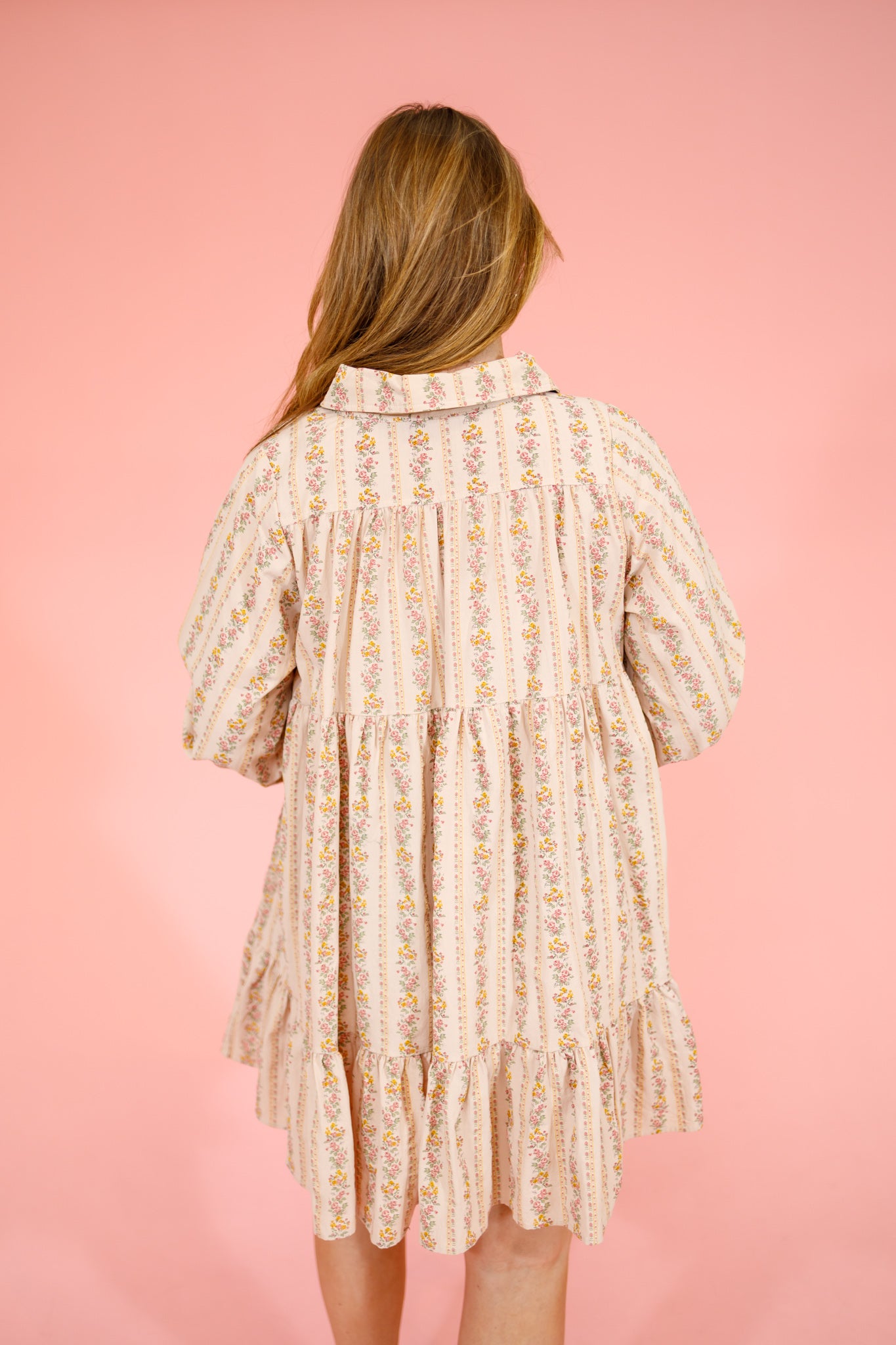FLORAL PRINT SHIRRING HALF BUTTONED TIERED SHIRT DRESS WITH SIDE POCKETS