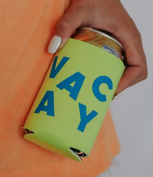 No vacation is complete without a cold drink in your hand and a fun drink sleeve to keep it that way! This lime drink sleeve with aqua text shows scattered letters that spell our our favorite word! This one is for sure getting thrown in our beach bag!