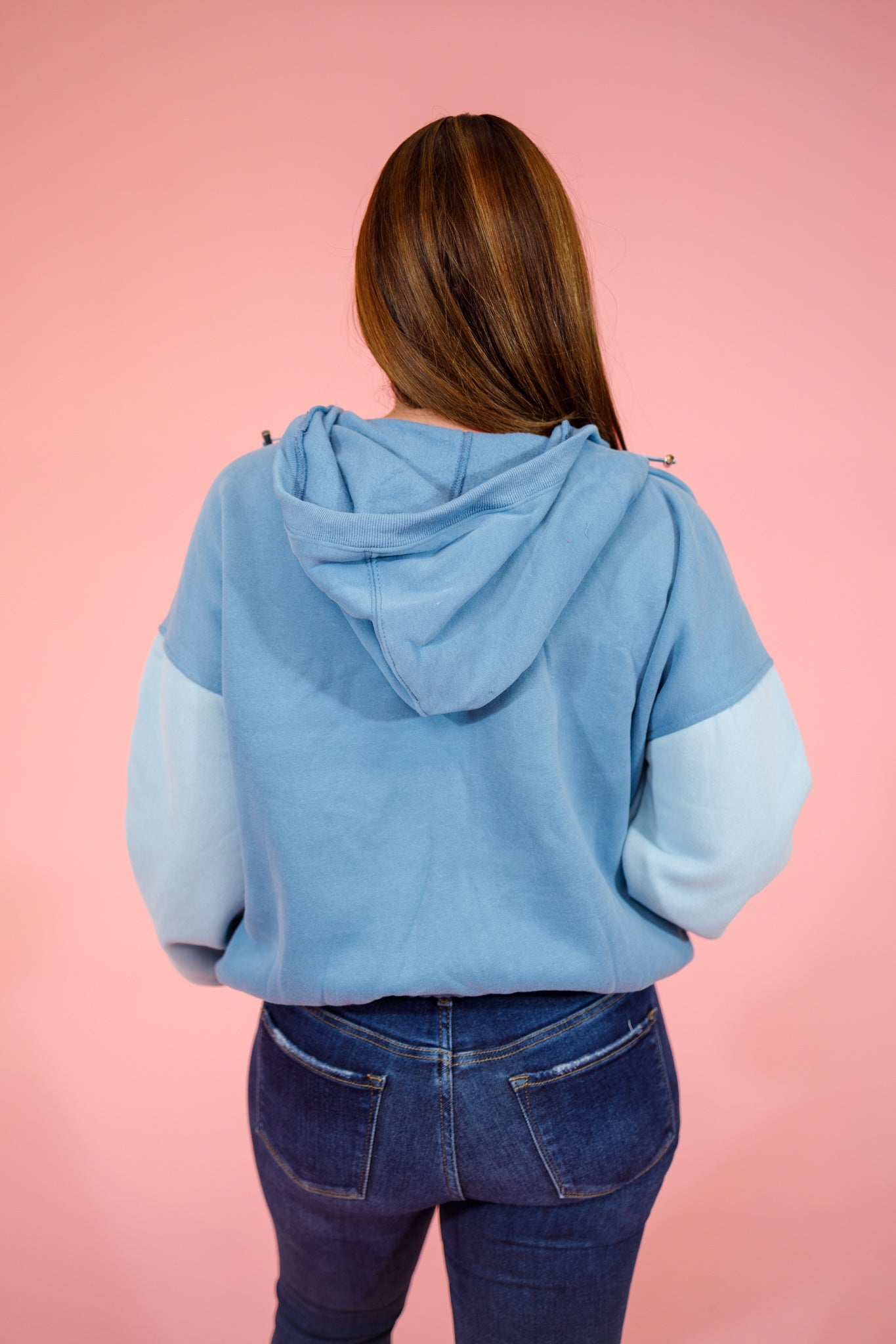 COLOR BLOCK STITCH DETAILED ELASTIC HEM HALF ZIP FLEECE HOODIE
