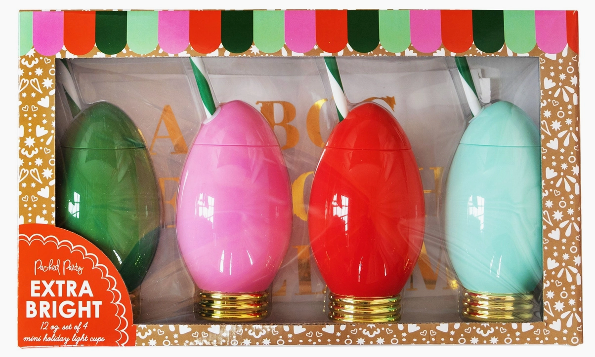 Celebrate the season with these four mini holiday light cup sippers. Featuring festive colors and spill-proof stoppers, they're perfect for parties, gift-giving, or holiday gatherings. SET OF 4