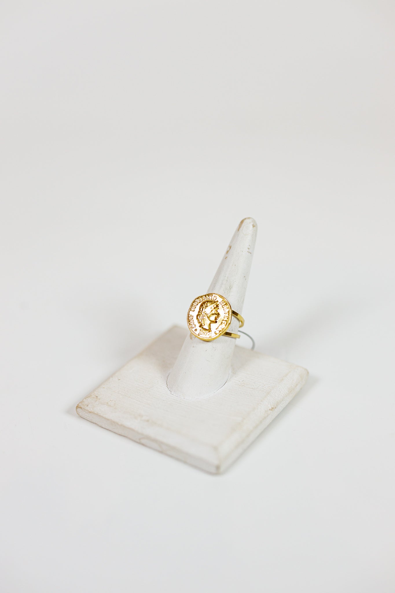 Gold Coin Cuff Ring A striking statement piece featuring a bold coin design in lustrous gold. This cuff-style ring makes an elegant addition to any jewelry collection, perfect for layering or wearing solo.