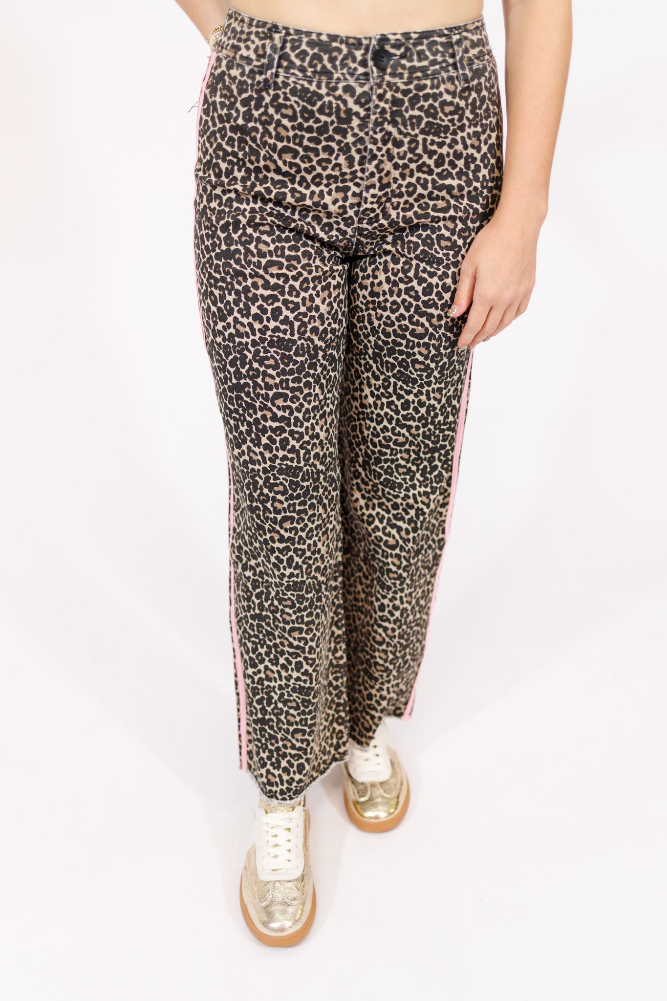 LEOPARD PRINTED PANTS WITH CONTRAST SIDE STRIPE DETAIL