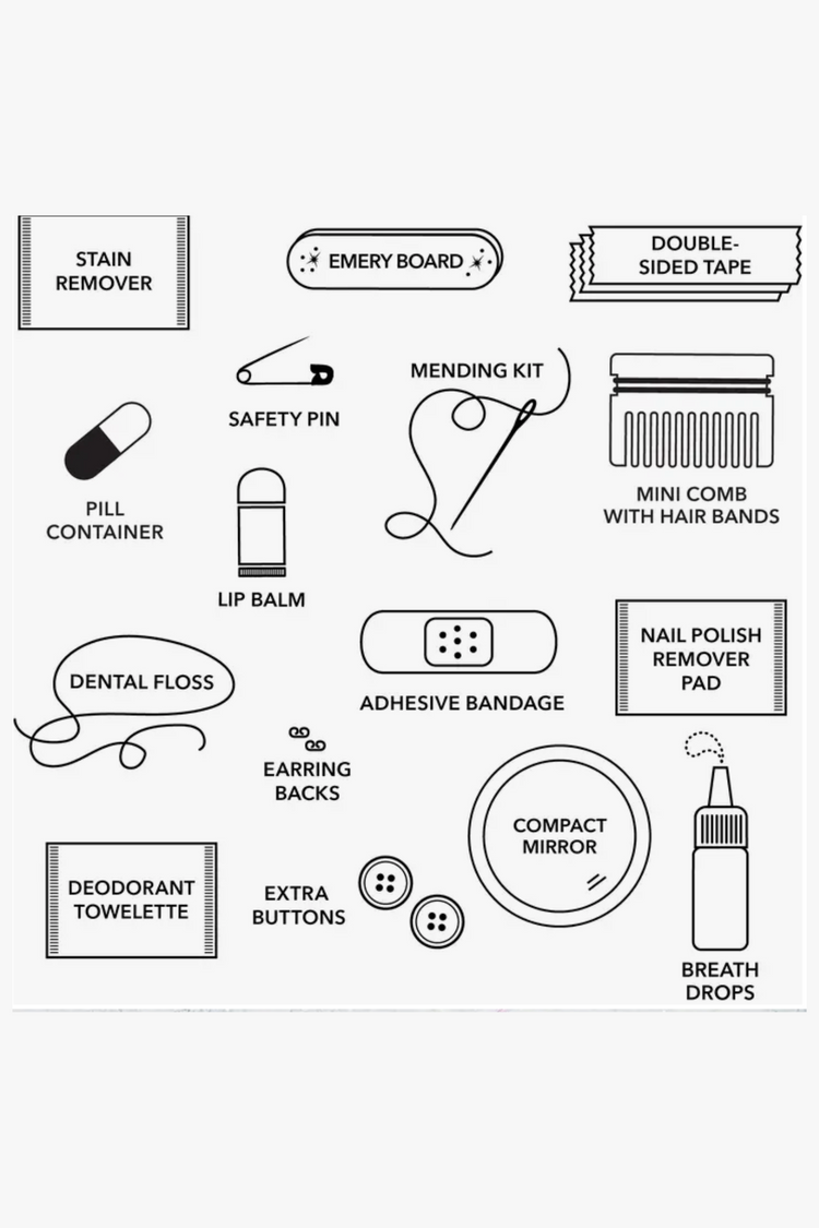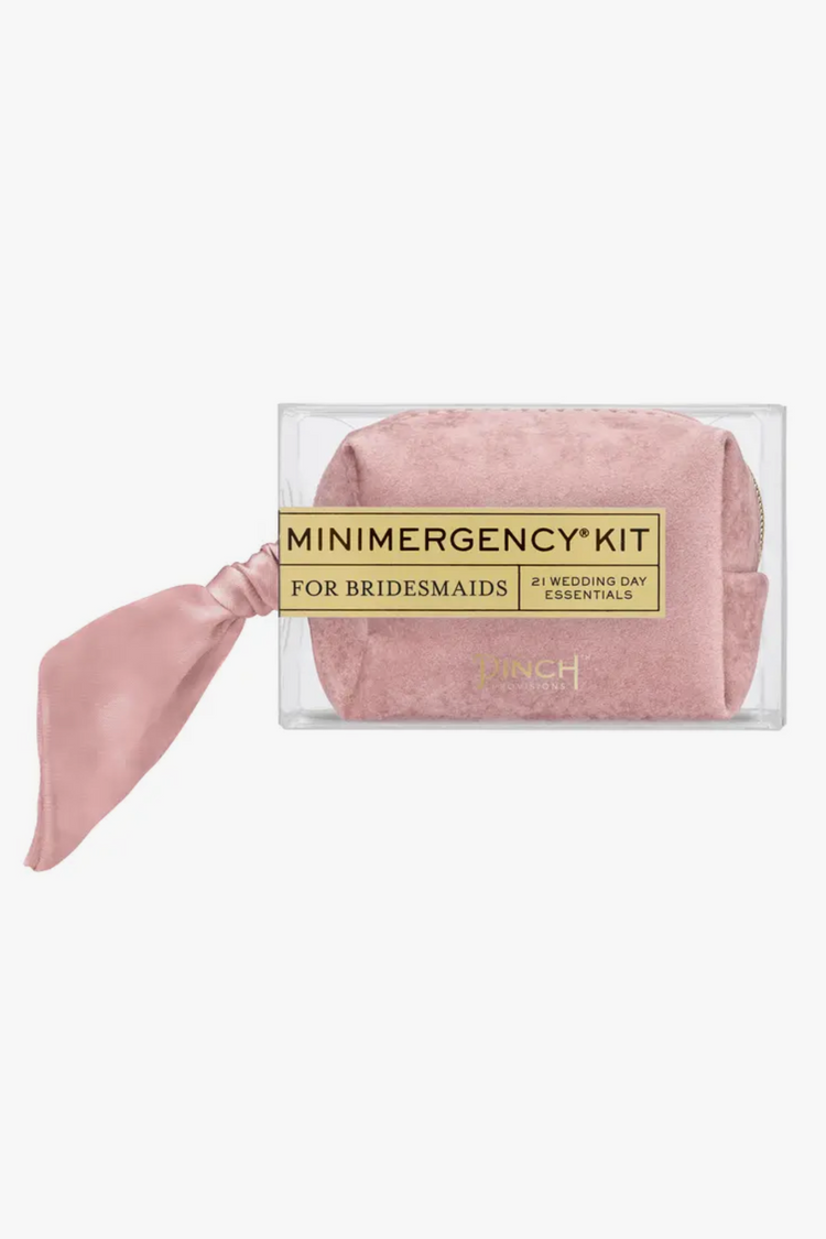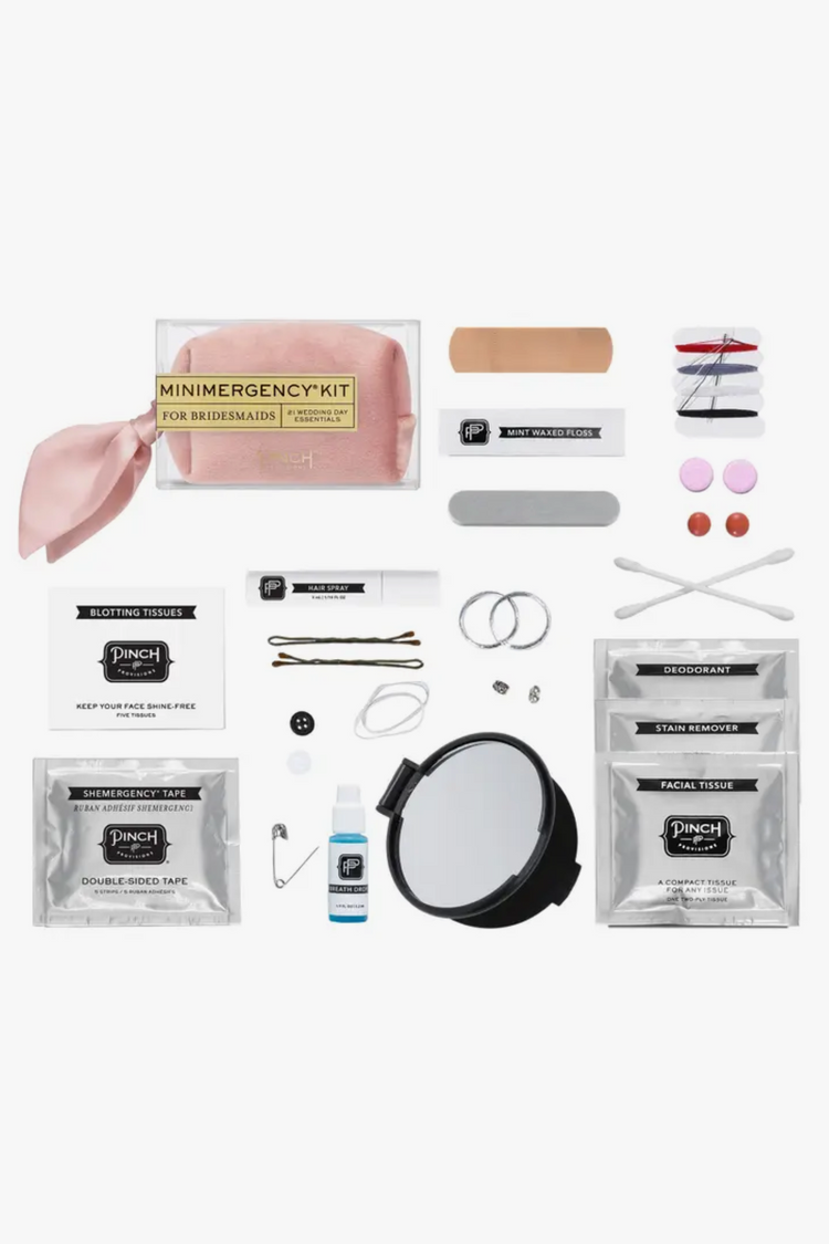 Our Velvet Minimergency Kits for Bridesmaids with matching scarf pulls contains 21 essentials: Hair spray, compact mirror, cotton swabs, emery board, earring backs, clear elastics, mending kit, safety pin, double-sided tape, stain remover, deodorant towelette, pain reliever, tampon, breath drops, dental floss, adhesive bandage, facial tissue, blotting tissues, bobby pins, antacid and extra wedding bands.