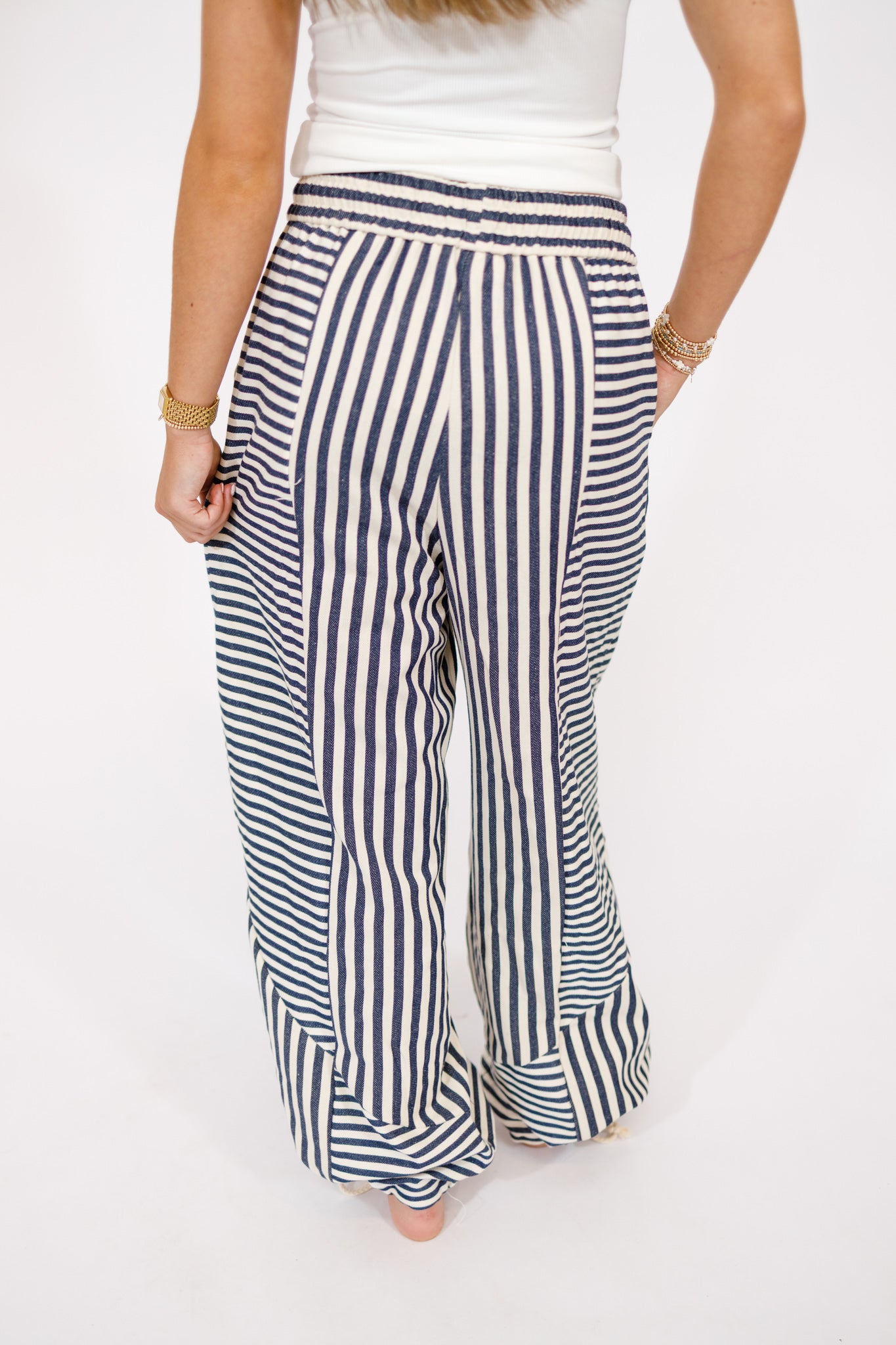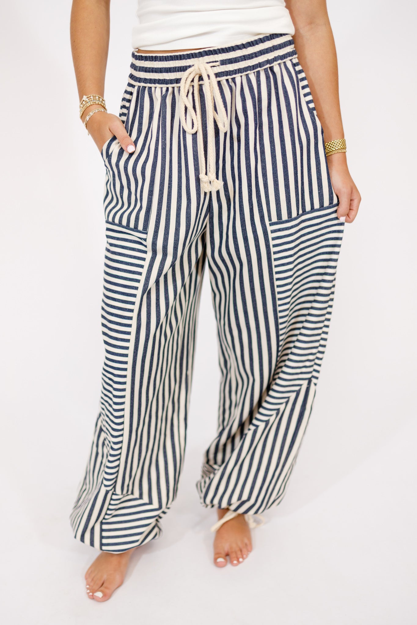 + Mixed stripes parachute pants + High rise elastic waistband + Drawstring waist with natural cotton cord + Harem style parachute fit + Adjustable drawstring cuffs + Pockets