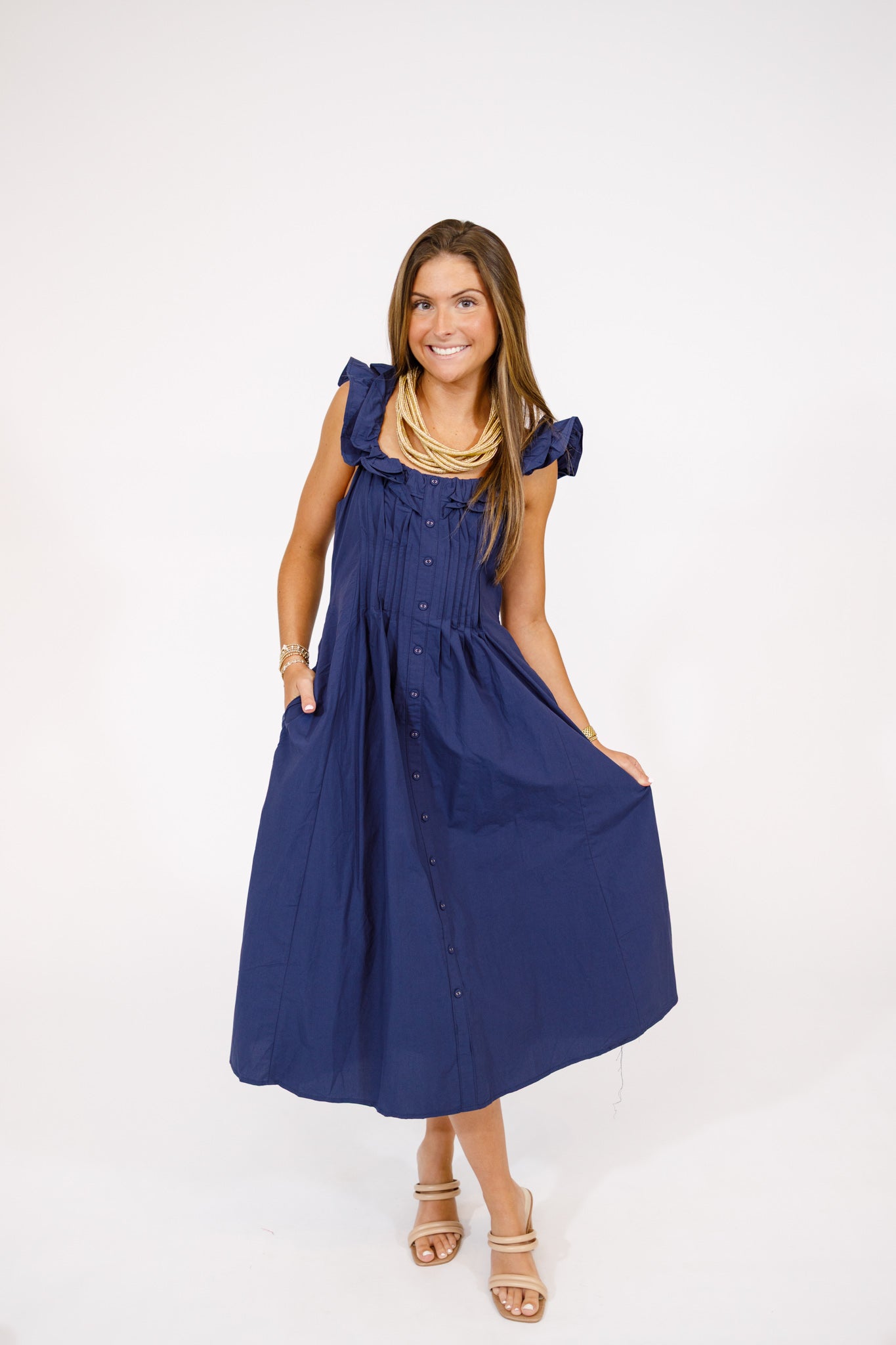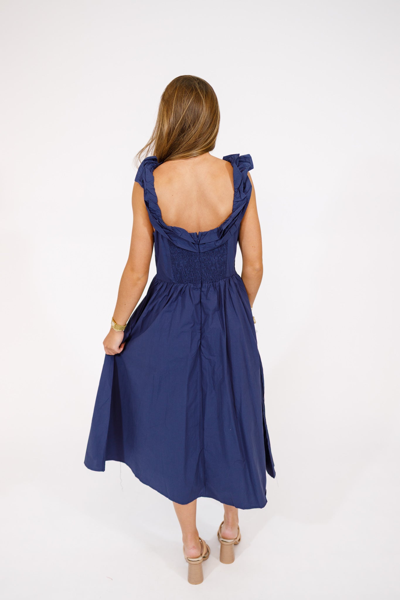This midi dress features a wide neckline with ruffle details, a pleated waist, and a smocked back for a flattering fit. Designed with a front faux button-down look and a hidden back zipper for effortless wear.