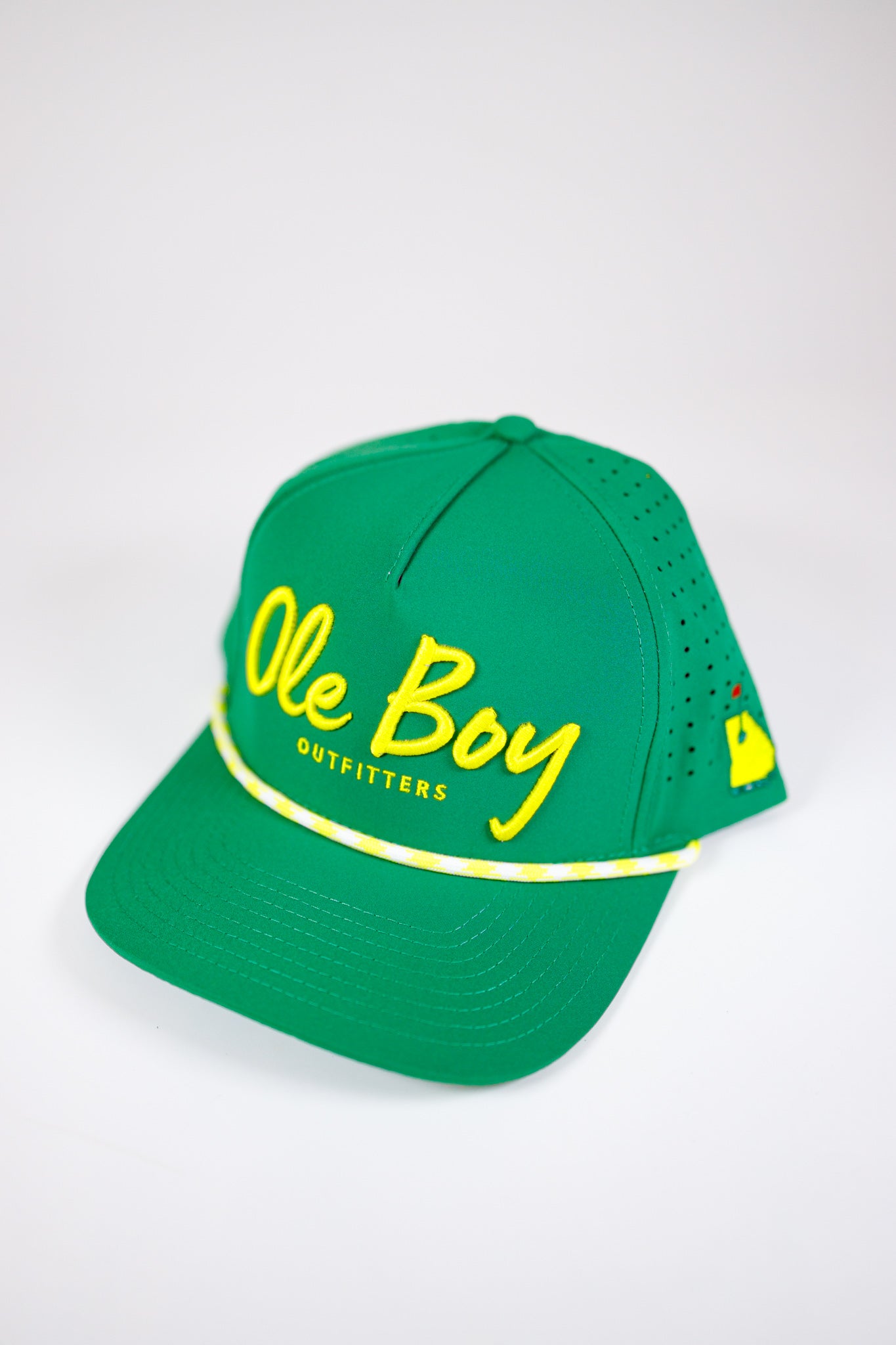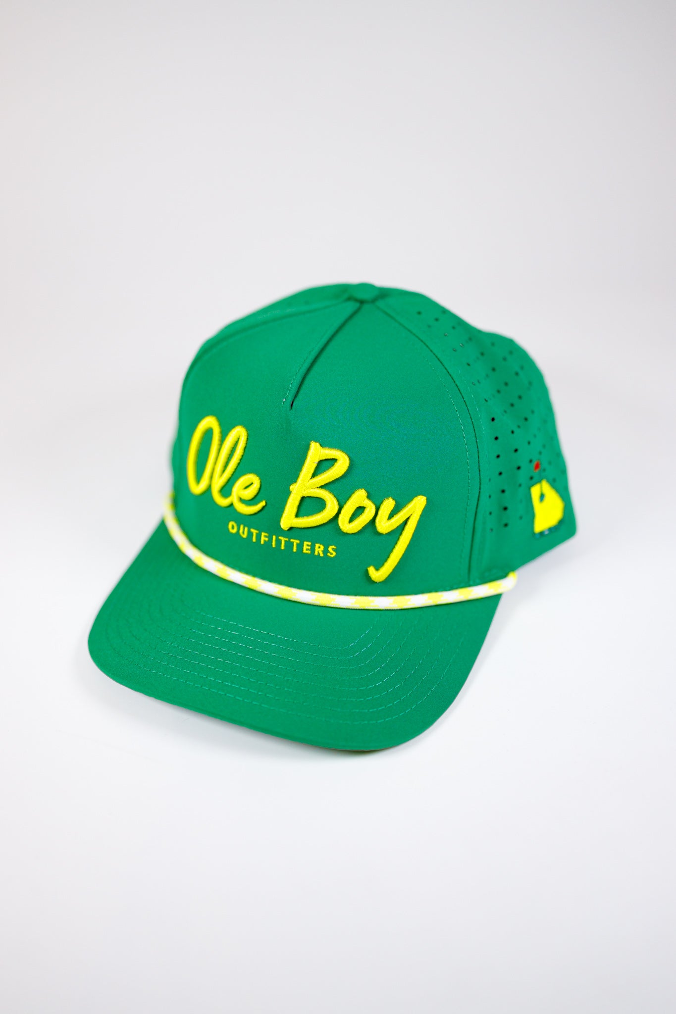 Stay cool and stylish on the green with the OLE BOY Augusta Performance Golf Hat. Keep the sun out of your eyes with the iconic green and yellow design, while the performance material keeps you comfortable. With our trademarked "What's Up Ole Boy!" under the bill and embroidered Ole Boy Outfitters on the front, you'll be turning heads on and off the course. * Polyester/Spandex Material * Waterproof Performance Fabric * Laser Cut Holes For Breathability * Mid Crown * 5 panel Rope Hat