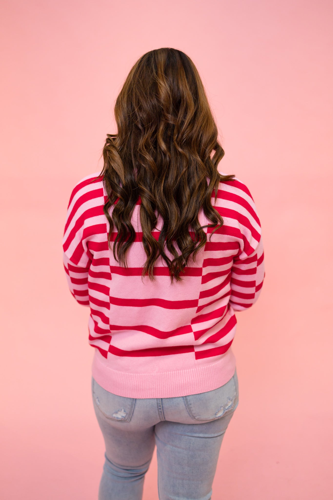 Pink and Red Stripe Ribbed Trim Sweater
