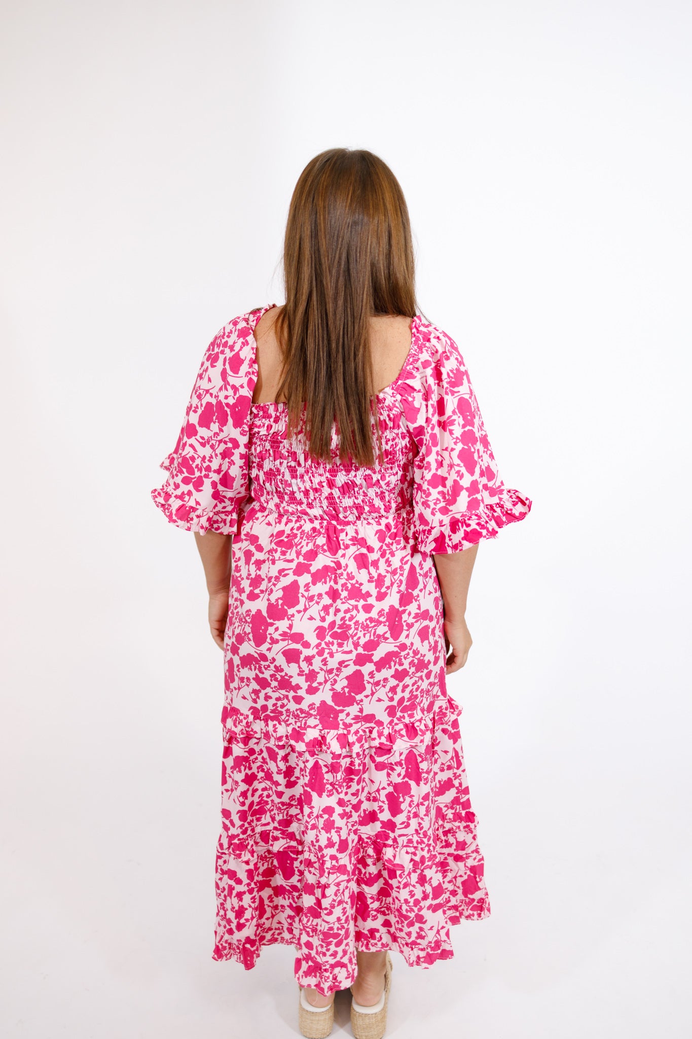 Embrace the season in this charming pink patterned smocked midi dress. Featuring delicate floral details and a playful tiered silhouette, this piece brings effortless spring style to your wardrobe. The smocked bodice offers a flattering fit while the flowing skirt creates movement and comfort. Perfect for casual outings, garden parties, or any occasion calling for a touch of whimsy. A versatile staple that transitions beautifully from day to evening wear.