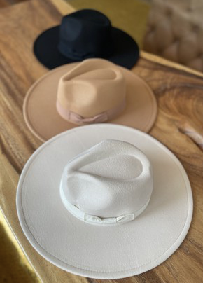 Structured wide brim panama hat in vegan felt. Matching leather belt Flat and stiff brim Adjustable inner drawstring Crown size: 57 cm Brim: 4 in. 100% polyester