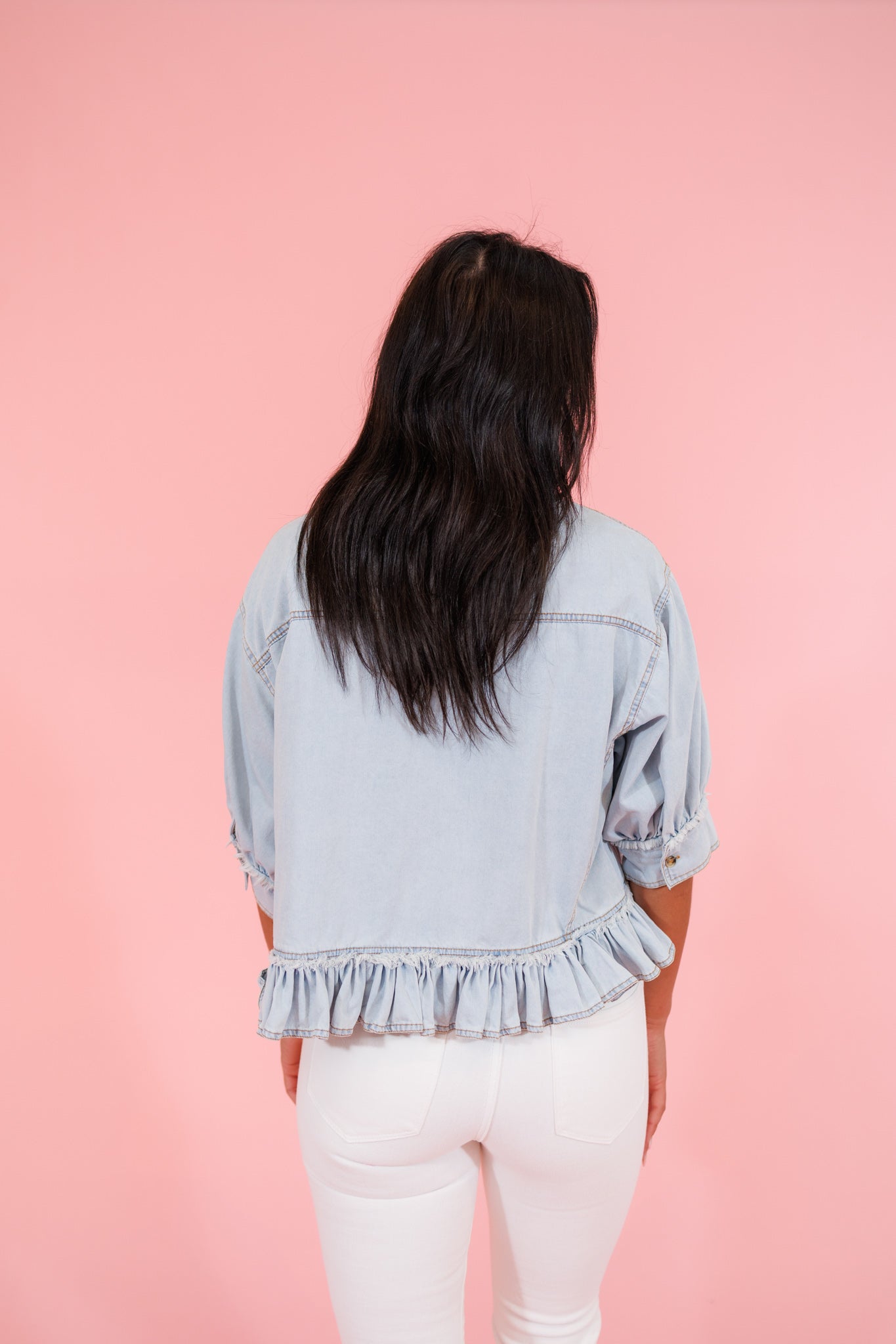 WASHED DENIM RUFFLED HEM BUTTON UP SHIRT 100%COTTON