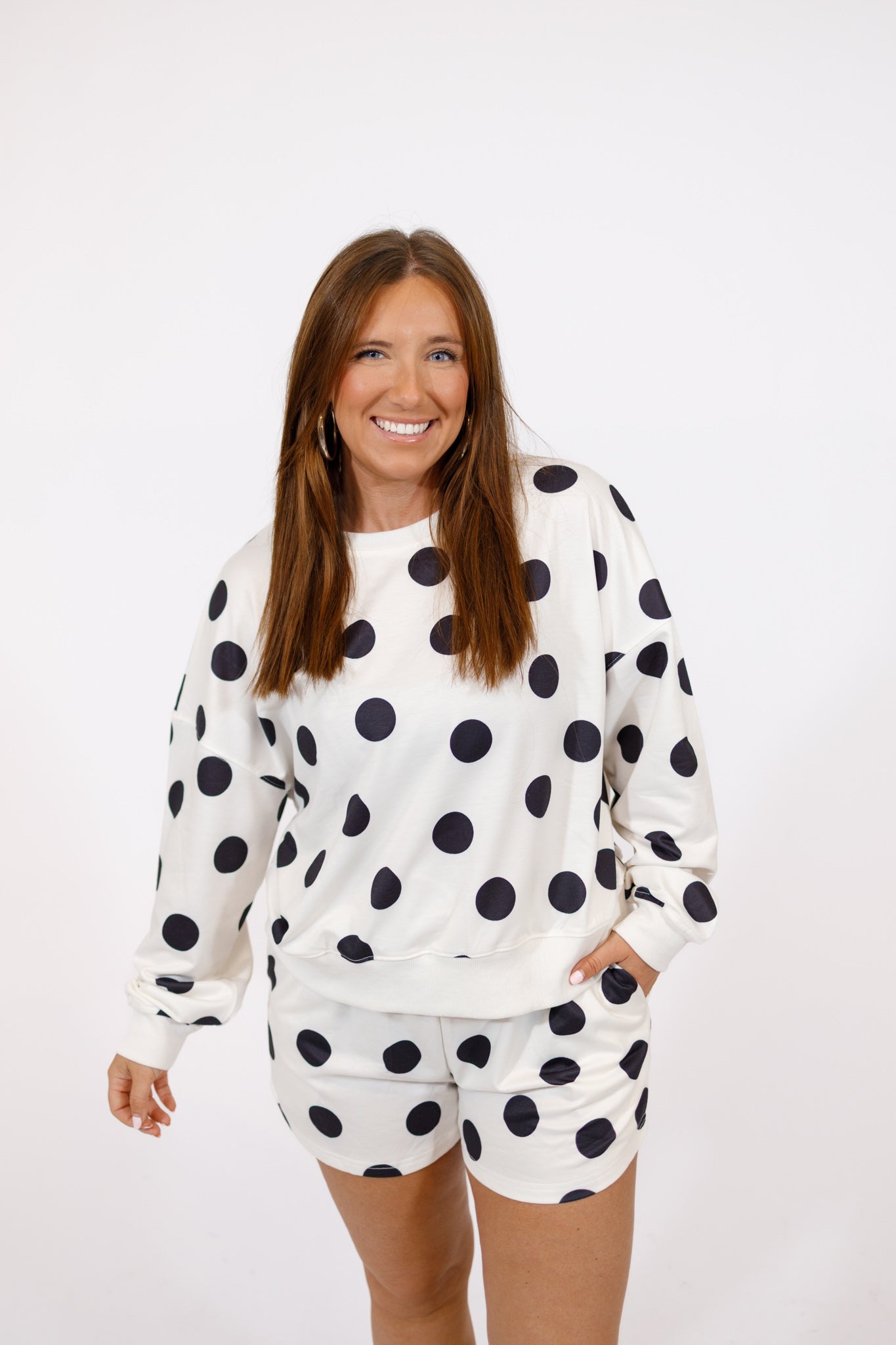 Embrace laid-back style with this charming polka dot set. The drop shoulder pullover top delivers an effortless, on-trend silhouette perfect for casual days, while soft drawstring shorts offer adjustable comfort whether you're relaxing at home or running errands. Ideal for anyone seeking versatile, comfortable pieces that don't compromise on style.