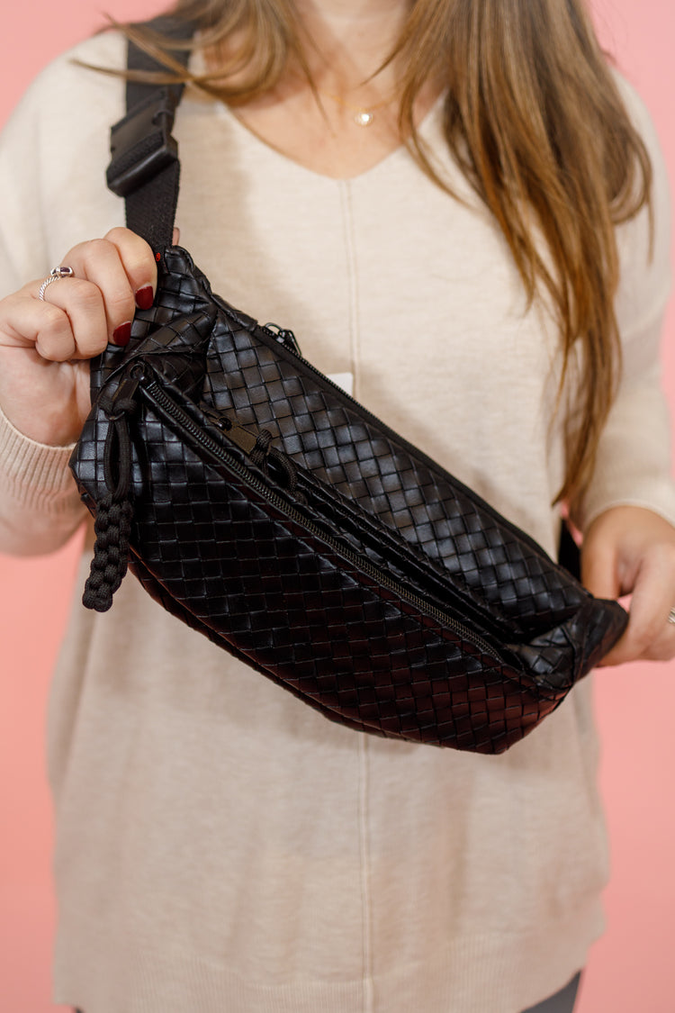 VEGAN LEATHER WOVEN ATLAS CROSSBODY BUM BAG - UNIQUE LUXURY WOVEN DESIGN - ADJUSTABLE STRAP - WATER RESISTANT - VERSATILE WEARING OPTIONS - STYLISH, MODERN AND DURABLE HARDWARE - PERFECT FOR ON-THE-GO - HEIGHT: 7.48", LENGTH: 14.57", WIDTH: 3.93"